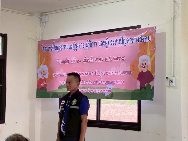 รายละเอียด : เมื่อวันที่ 21 สิงหาคม 2568 นายสมพงษ์ อบคำ นายกองค์การบริหารส่วนตำบลดอนมดแดง เป็นประธานเปิดโครงการฟื้นฟูสมรรถนะผู้สูงอายุ  ผู้พิการ และผู้ประสบปัญหาทางสังคม ณ ศูนย์พัฒนาคุณภาพชีวิตและส่งเสริมอาชีพผู้สูงอายุตำบลดอนมดแดง เพื่อให้กลุ่มเป้าหมาย มีความรู้ ความเข้าใจ ได้เสริมสร้างสมรรถนะทางร่างกาย จิตใจ และสร้างกำลังใจความภาคภูมิใจในคุณค่าของตนเอง